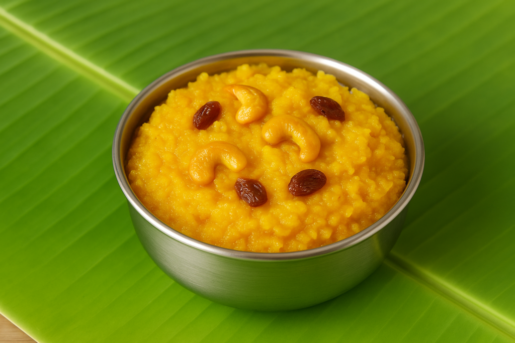 A complete satvic thali served on banana leaf — includes rice, kootu, poriyal, sambar, rasam, curd, and a sweet. Prepared freshly without onion or garlic.